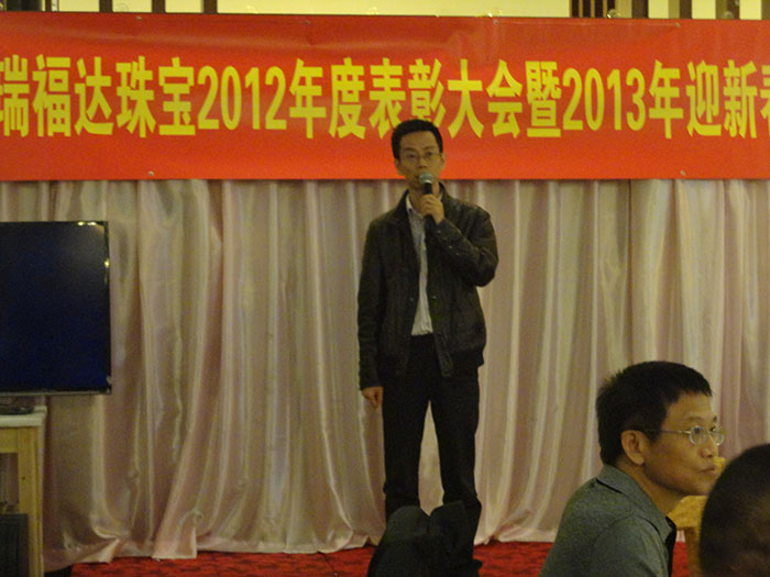 2012年12月31日下午6时,瑞福达珠宝2012年度工作总结暨表彰大会于顺德轩酒楼隆重开幕。本次会议由条戒厂汪正文、办公室李玉霞主持。参加本次会议的有公司领导以及全体员工。